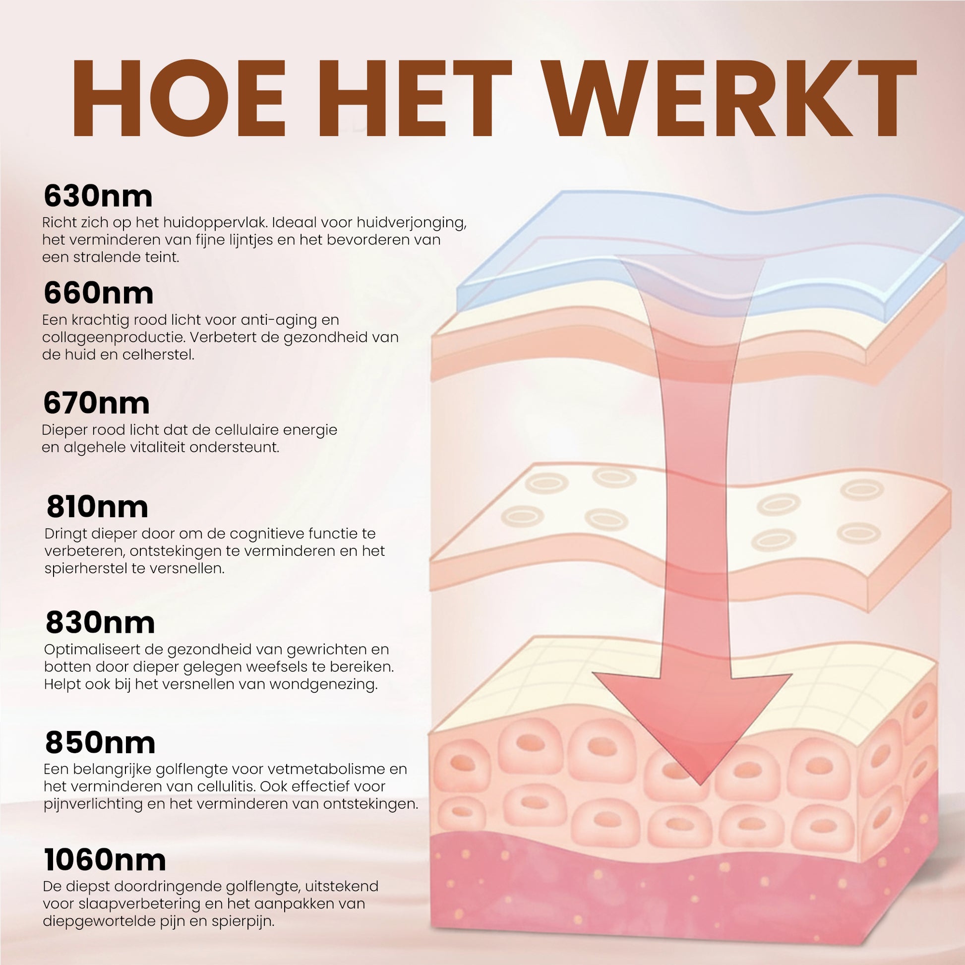 Synergie: werkt het sterkst in combinatie met 630 nm (oppervlakte) en 660 nm (diepere huidlagen).
